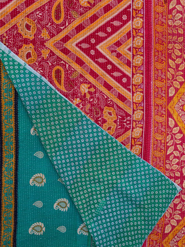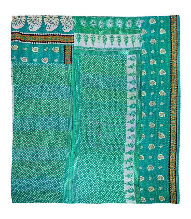 Cool Courtyard: Cool green ground sprinkled with tiny white dots and small butis. Rows of stylized flowers and paisley in cream and gold are patterned with narrow orange borders. A soothing leafy contrast to the vibrant reverse. This style evokes the quiet of a shaded cool courtyard garden.