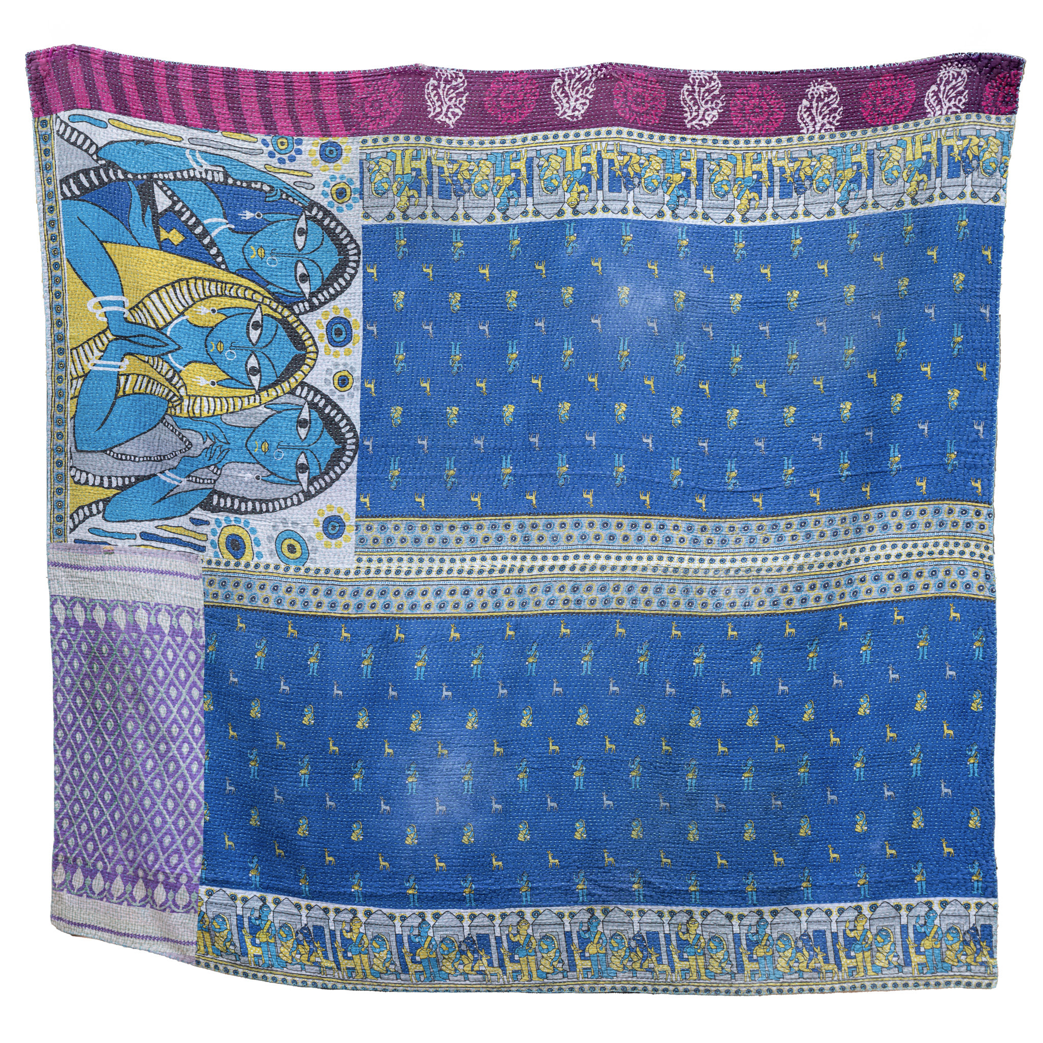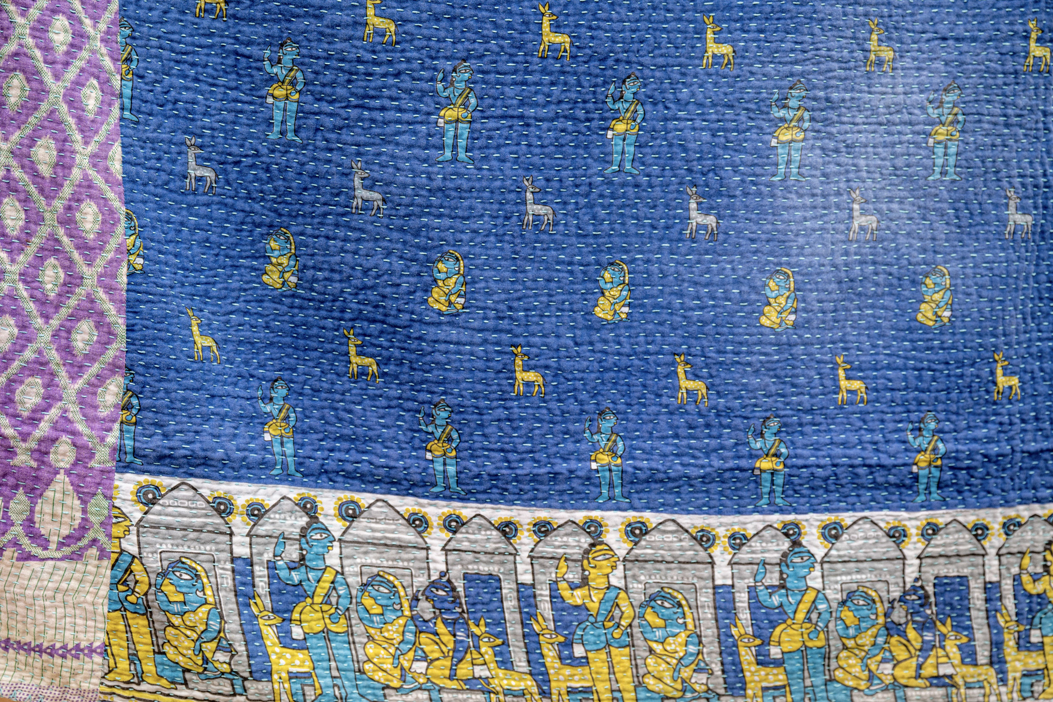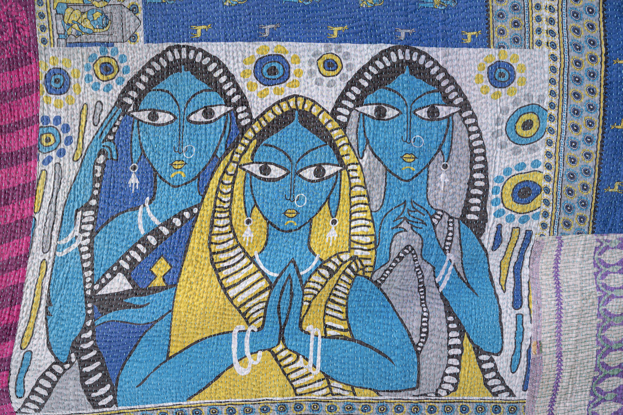 Kishangarh: A deep blue expanse framed with patterned borders in gold, teal, and lavender. Calm and steady like still water under a painted dusk sky. Almond eyes from Kishangarh paintings.