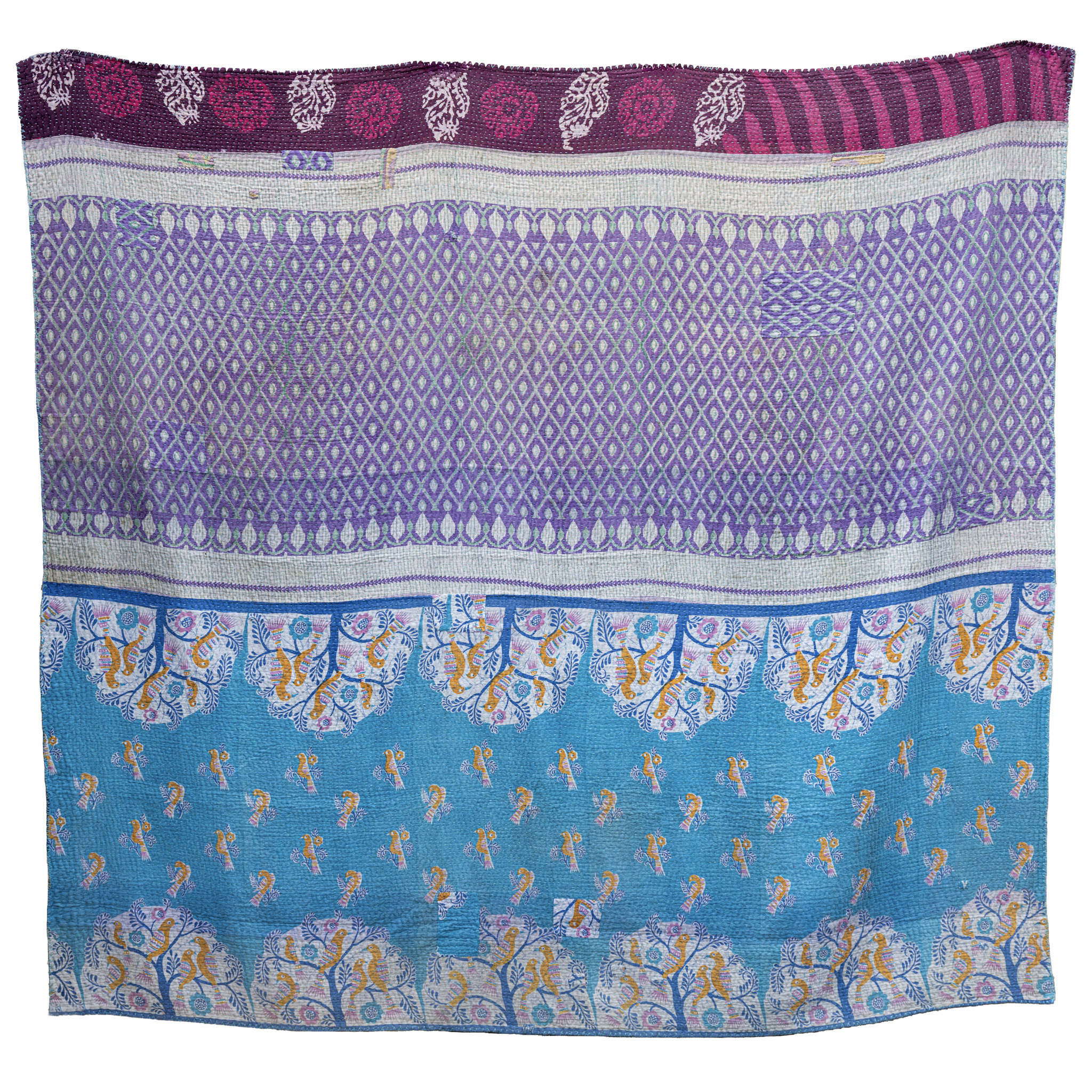 Gardens in Kishangarh: Turquoise floral fields merge with a violet diamond weave in a lush, jewel-toned pairing. Vibrant and full of life like a garden in full bloom.