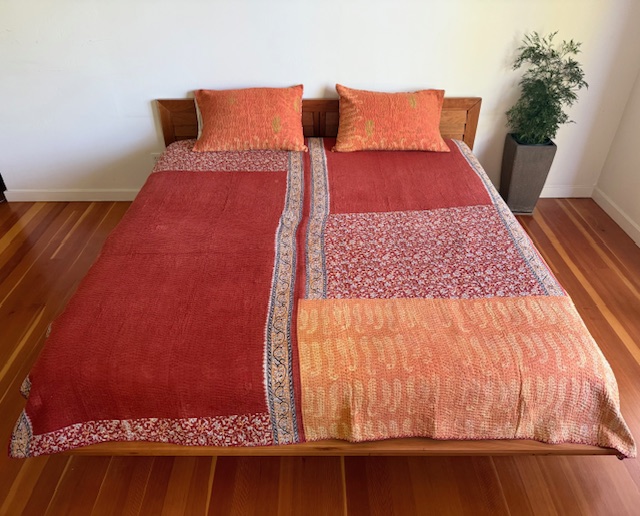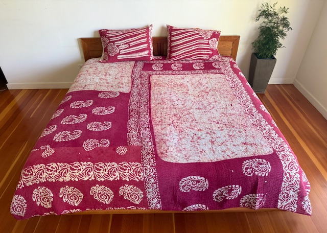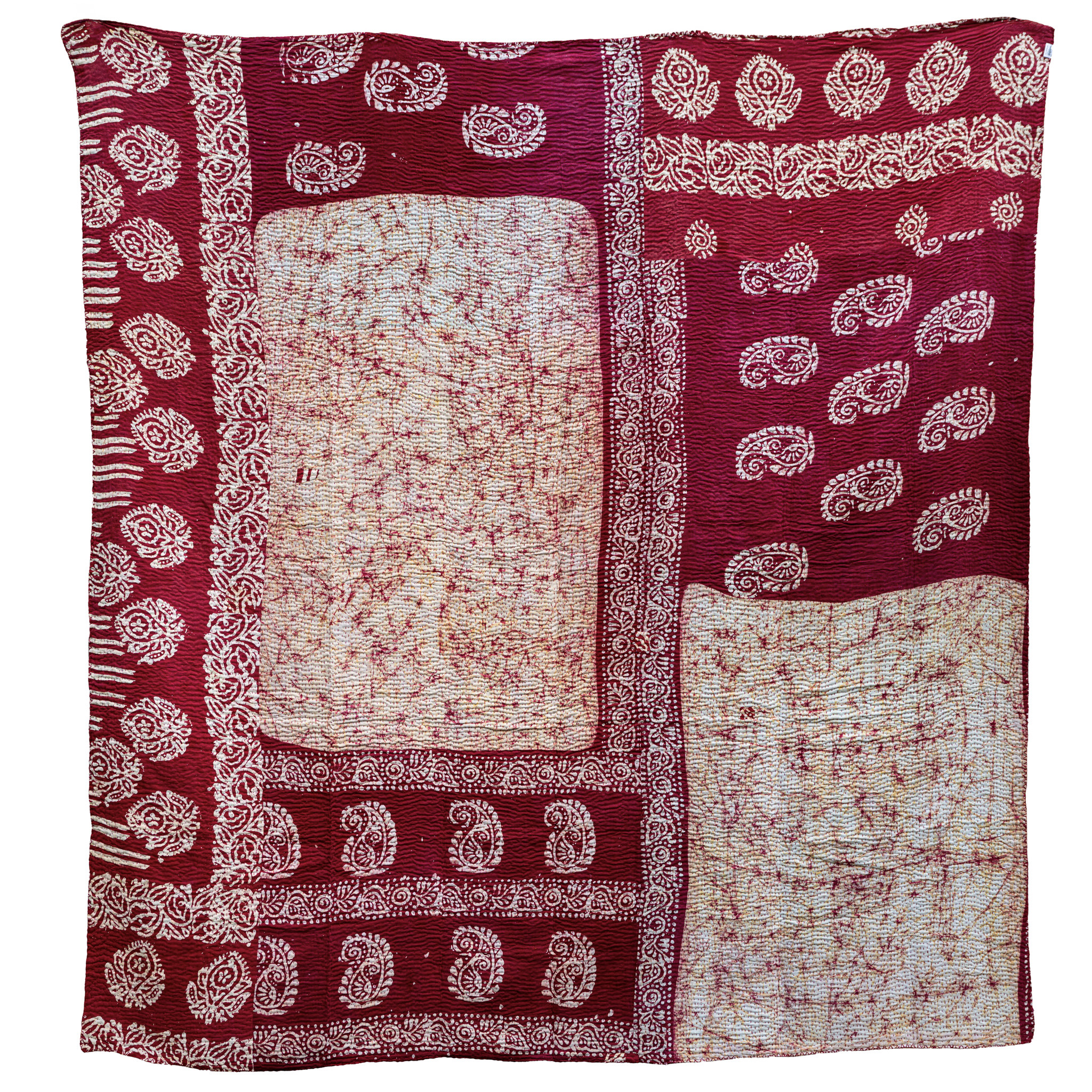Scattered Paisley: A striking interplay of deep crimson and soft cream, this kantha bursts with personality. Scattered paisleys dance across the surface, framed by bold floral borders and soft speckled panels that bring a sense of movement and balance. The design feels vibrant yet calming, making it equally at home as a statement throw or a warm accent for your space.
