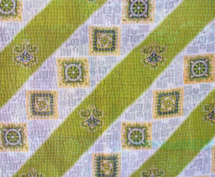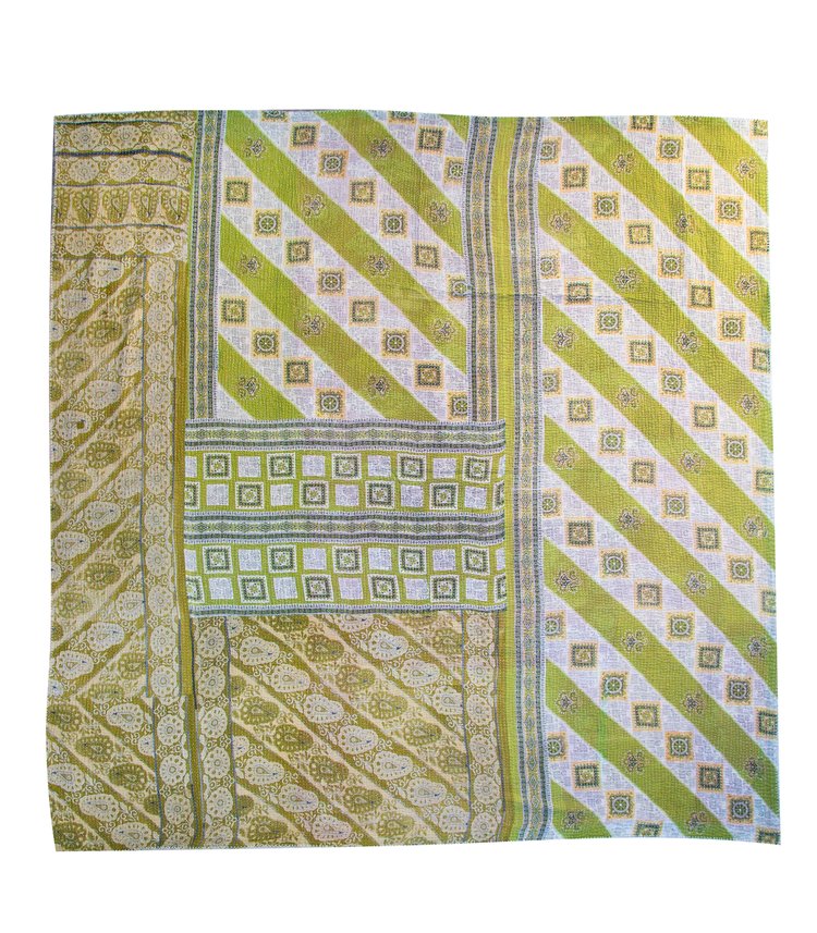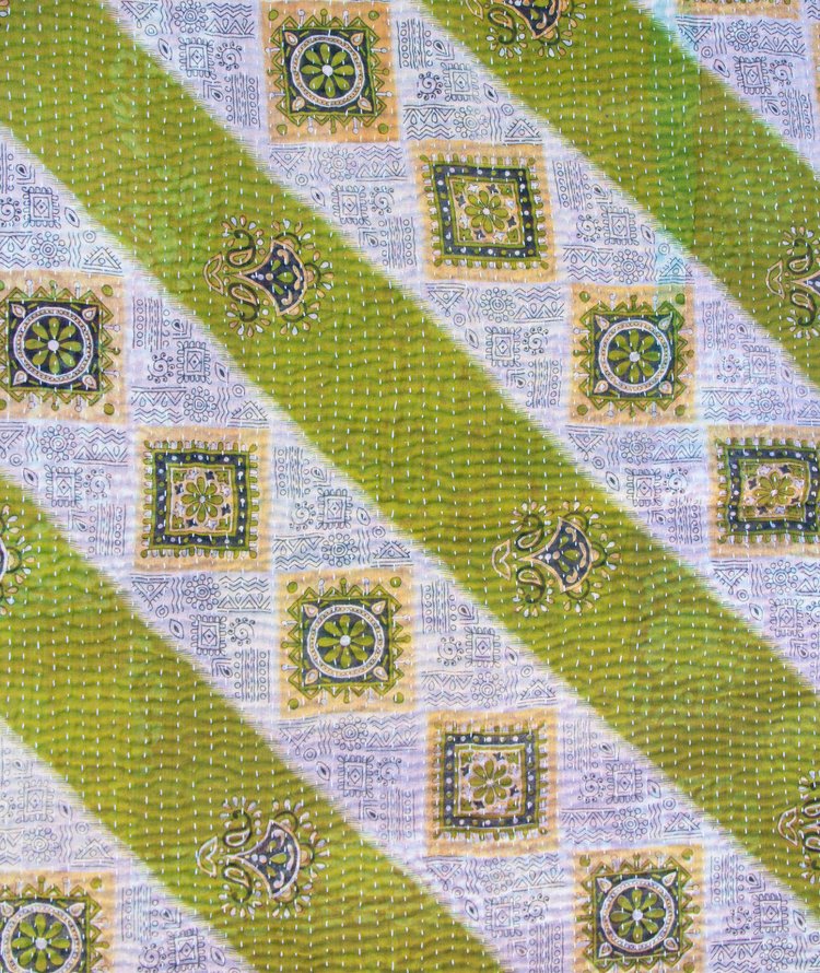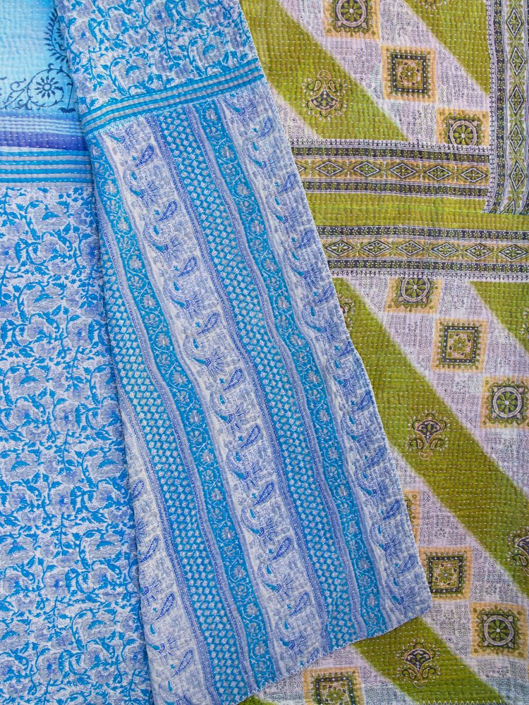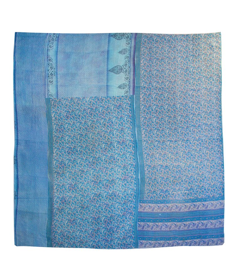 River Delta: This side is a tranquil tapestry of layered blues from sky to deep river waters arranged in panels of delicate vines, floral sprays and traditional paisley borders. The kantha stitches run across the surface like ripples of water, enhancing its handmade depth. Serene and cool, it is ideal for creating a restful, coastal-inspired atmosphere on your bed or sofa.