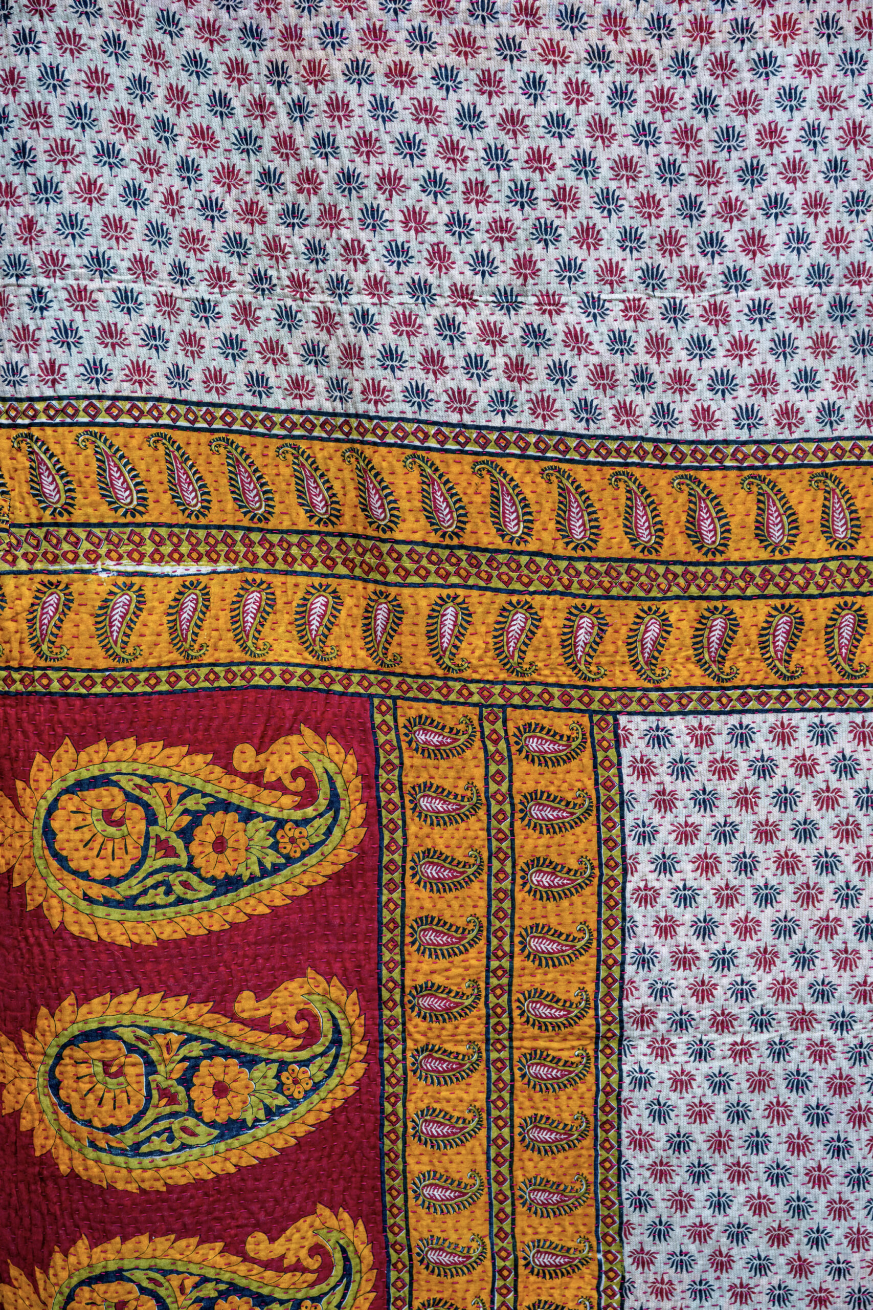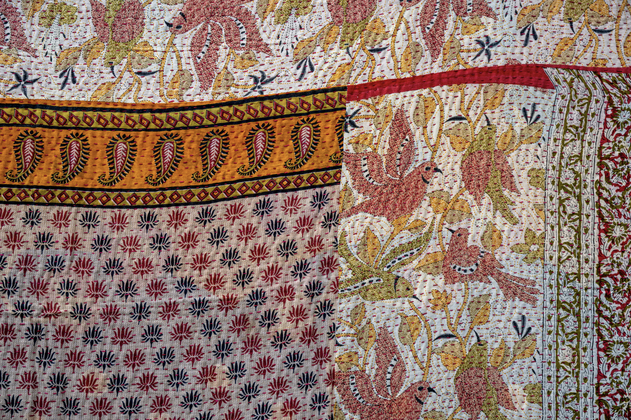 Kaledeo Songbirds: A mosaic of crimson paisley borders and delicate floral repeats in warm orange and gold. Playful and bright, with the energy of song birds in fresh floral bushes.