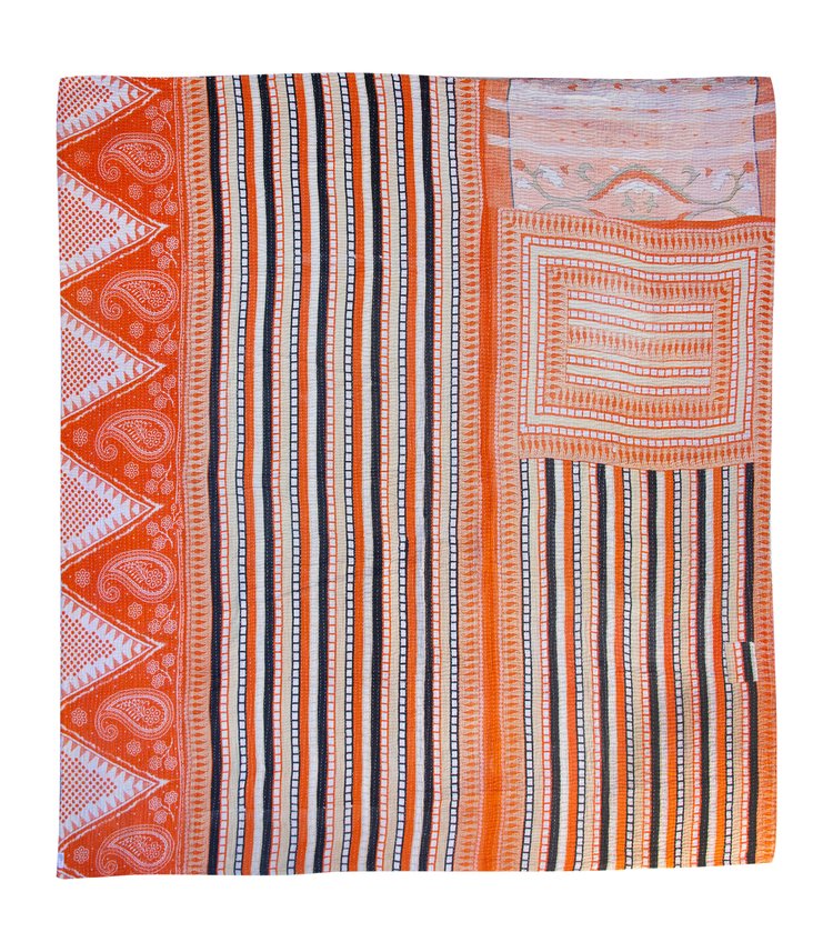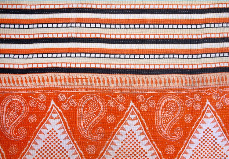 Ochre Caravan: This side combines warm, earthy orange with bold black and white stripes. Triangular panels filled with intricate paisleys and tiny floral dots run along the border, evoking festive temple bunting. The mix of stripes and paisleys creates a lively yet balanced look, perfect when you want a bold, modern statement with a traditional twist.