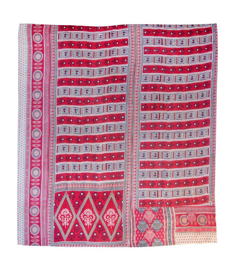 Red-Fort medallion: Rich ruby-red ground patterned with elegant diamond medallions and tiny floral curls. The repeating geometric motifs give this side a classic, heritage feel like the Red Fort in Delhi. Lush and ornate, ideal for adding a warm, jewel-toned accent to a room.