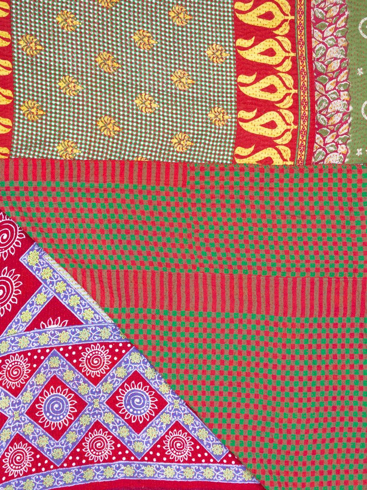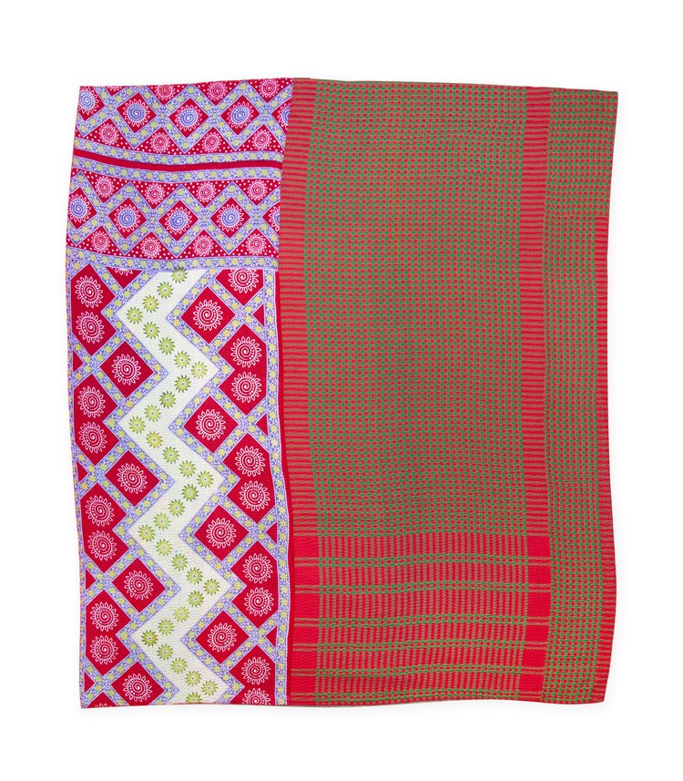 Sunrise picnic: Bold geometric bands of red, lavender, and cream with sunburst and spiral motifs zigzag across one edge, contrasted with panels of red and green checks. Narrow stripes in warm reds add rhythm, making this side feel contemporary and graphic while still handstitched. Playful yet grounded
