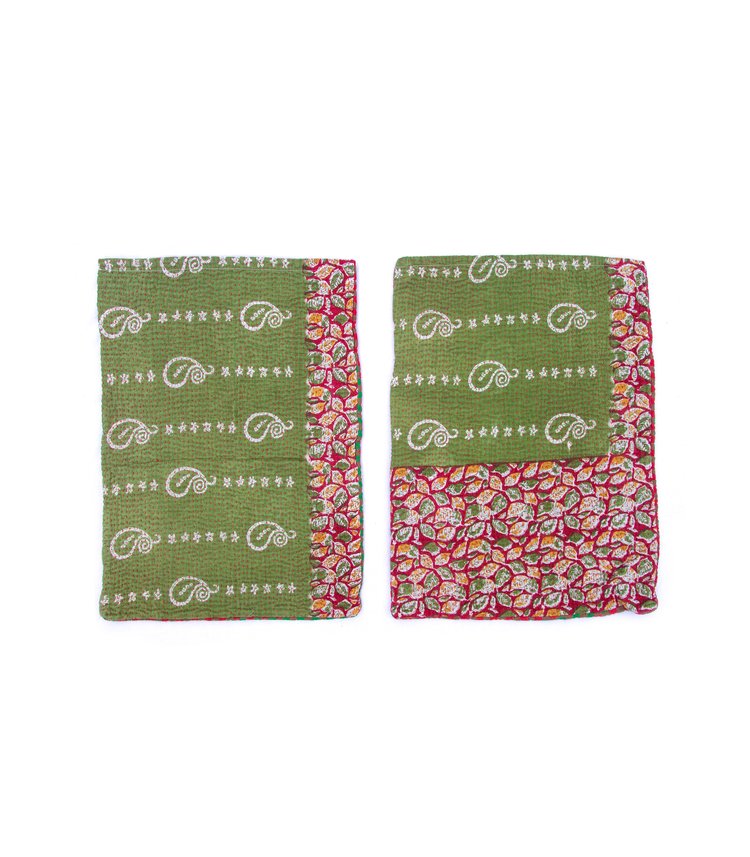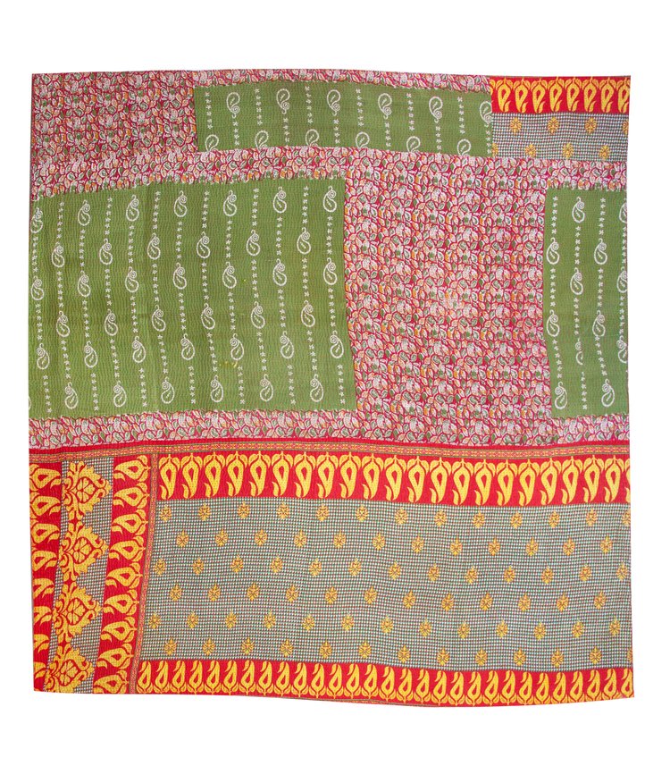 Verdant Paisley Patchwork: A patchwork of deep olive-green panels with delicate white paisleys is offset by floral vines in pink and red. A striking saffron-yellow and crimson border in stylized leaf motifs frames the bottom. Earthy and vibrant, evoking the textures of vintage saris.